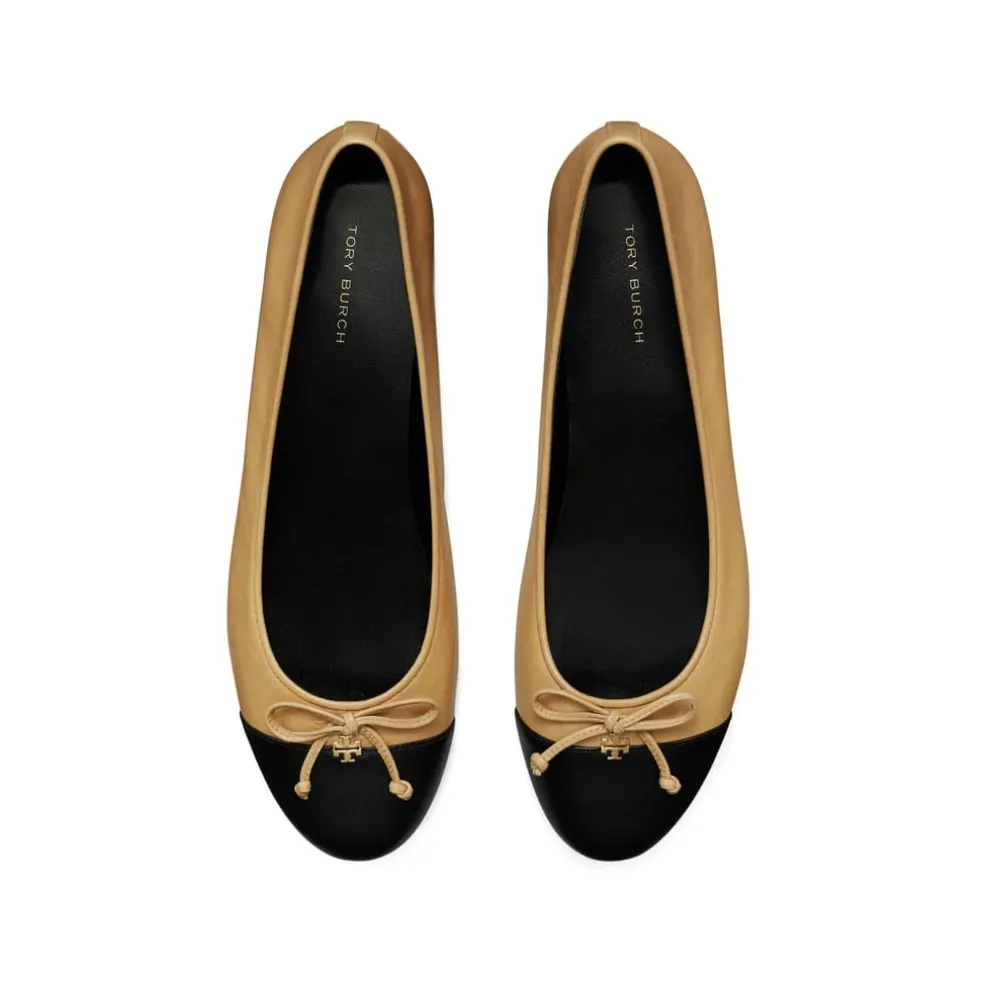 Dance into the night with these Cap-Toe Ballet Flats from Tory Burch. Crafted from 100% leather they boast a classic design with a cushioned leather footbed, and napa leather lining, that offers comfort and style making it the perfect choice for extended wear. The design runs narrow on the feet and is paired with a low heel and bow design making them the perfect addition to any elegant ensemble. The iconic branding is delicately placed on the toe of the flat for a touch of exclusivity. Ideal for both casual and formal occasions, this ballet flat effortlessly transitions from day to night, bringing with it an understated charm and luxurious appeal. With its intricate detailing and impeccable craftsmanship, this ballet flat exemplifies Tory Burch’s dedication to creating timeless, versatile pieces that elevate everyday experiences.
