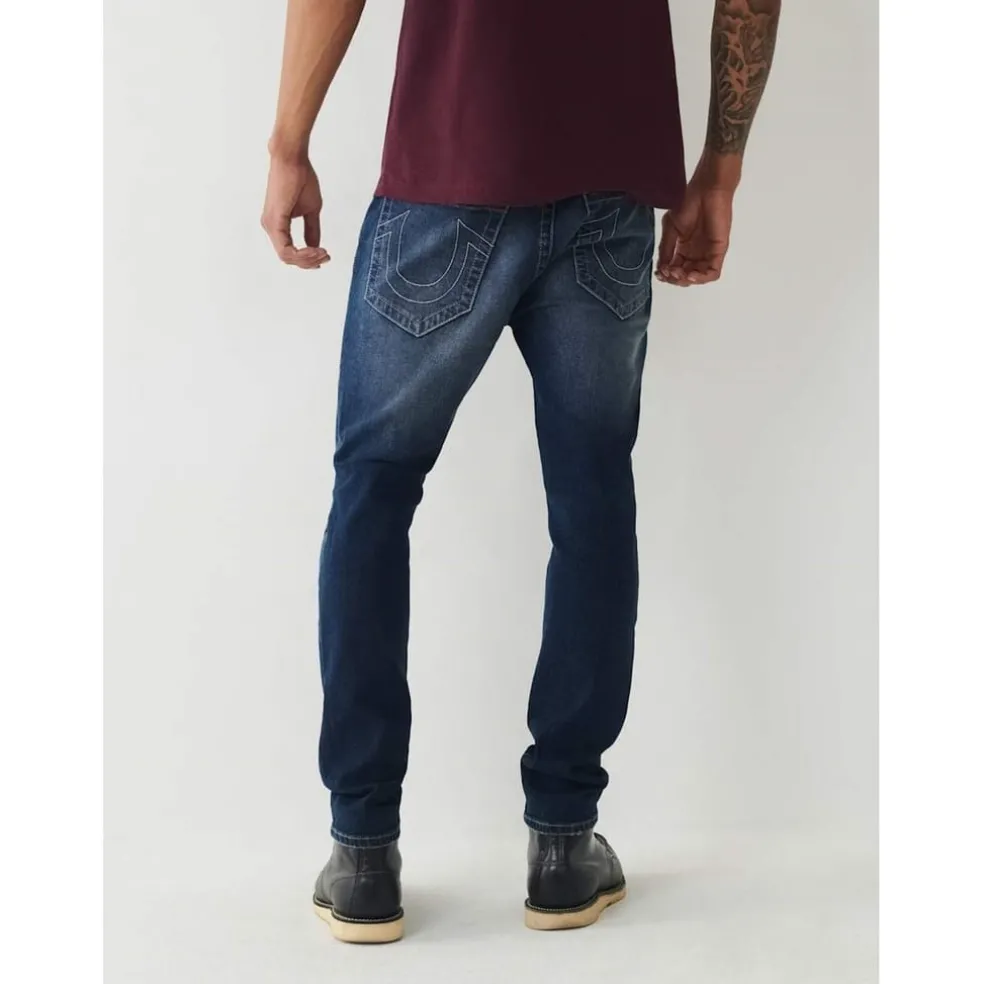 True Religion presents these distressed jeans, featuring a skinny fit for a sleek silhouette. The design includes a zip fly and button closure, enhanced with a logo and contrast stitching for added detail. Perfect for those seeking a stylish and contemporary look.
