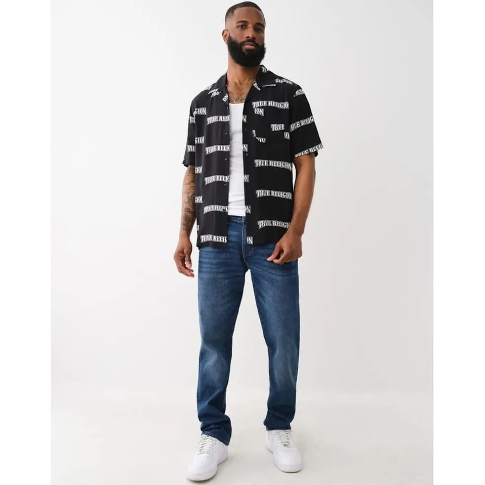 This True Religion top is a casual staple featuring a regular fit and short sleeves. The shirt collar and button-down closure add a classic touch, while the all-over logo print and lettering graphic provide a distinctive look. A logo embellishment completes the design, making it a versatile addition to any wardrobe.