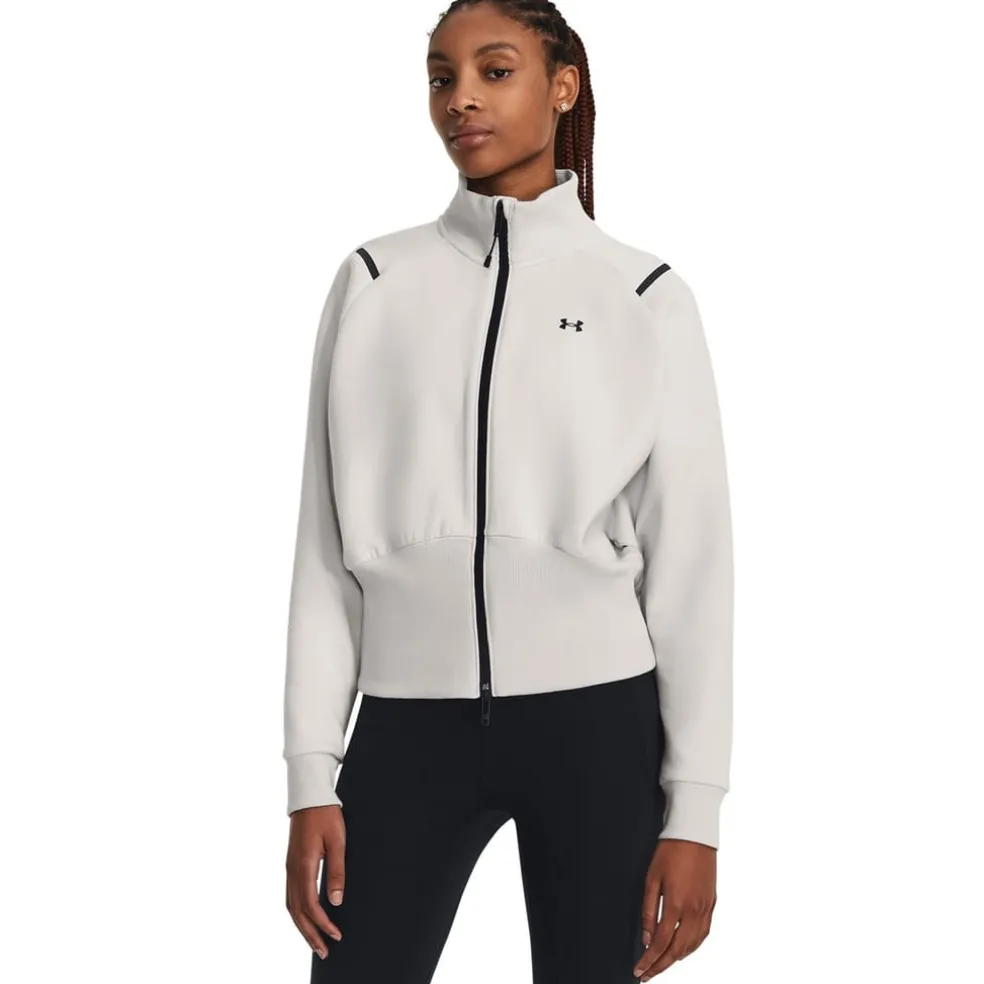 Stay comfortable and stylish with the Under Armour sweatshirt. This long sleeve jacket features a functional full zipper closure, a mock neck, and a relaxed fit for ease of movement. The raglan sleeves and ribbed cuffs add to its sporty appeal, while the solid pattern and subtle logo embellishment keep the look sleek and modern.