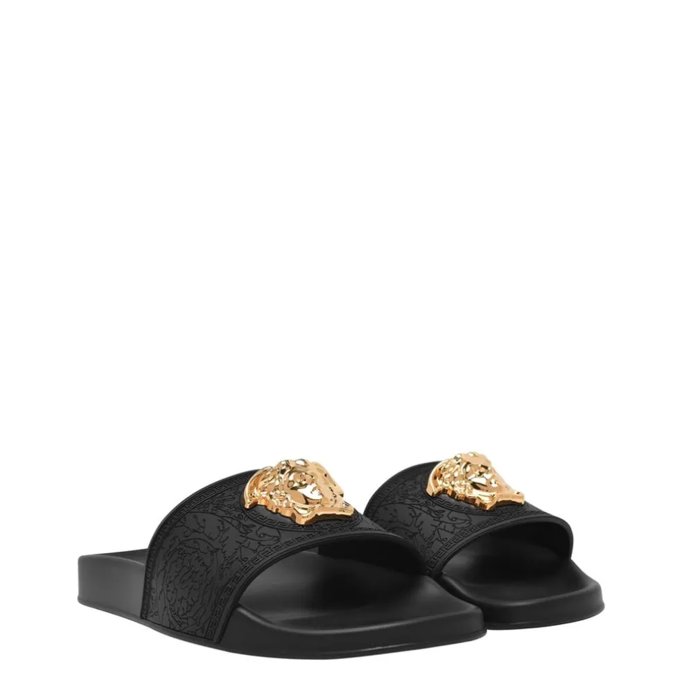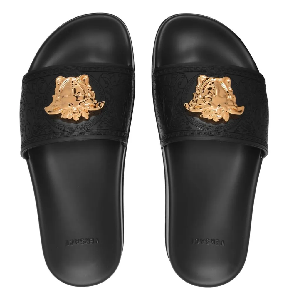 – Designed with a moulded footbed, these sandals are designed to provide exceptional support, allowing you to take every stride with confidence and ease. With an open round toe and slip-on style, these pool slides effortlessly combine style and convenience. Complete with the iconic Medusa head hardware at the front, Versace’s unparalleled luxury style will instantly elevate your poolside ensembles.