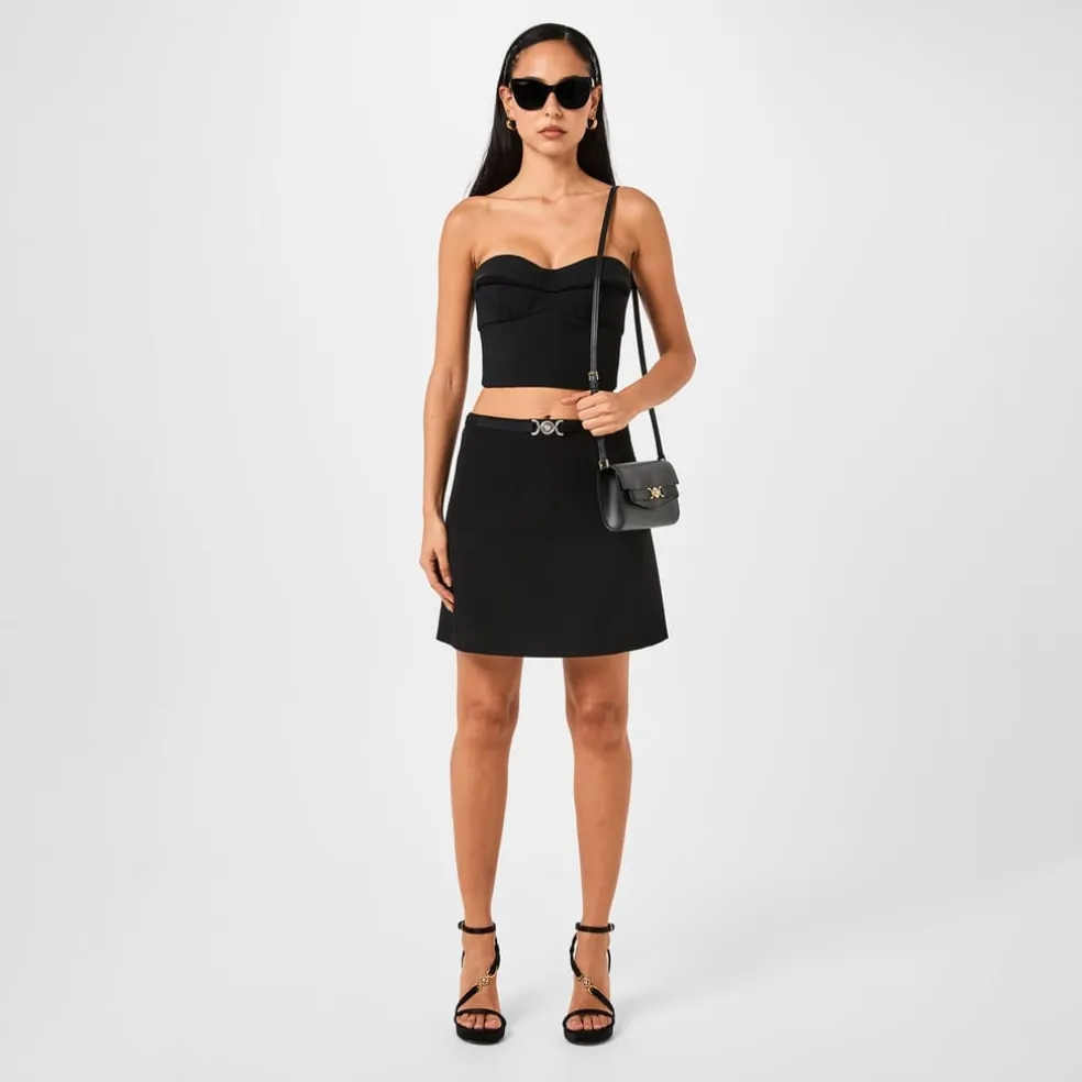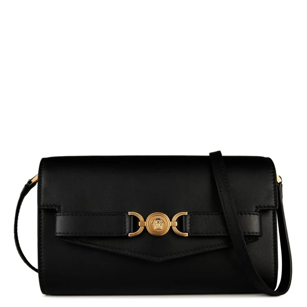 – Crafted from luxurious calf leather with a sumptuous lambskin lining, this mini bag is created with the finest materials. Designed to cater to the discerning needs of the modern luxury consumer, the Medusa Mini Bag comes with a detachable and adjustable leather shoulder strap, allowing you to personalise your carrying style. Its foldover flap features a magnetic snap button closure, ensuring your belongings are secured while adding a touch of convenience to your daily life. Inside, you’ll find an internal slip compartment, providing a designated space to organise your small essentials. Adorned with intricate gold metal stud detailing, the bag showcases the attention to detail that Versace is renowned for. The gold-tone Medusa hardware strap detail on the front adds a captivating focal point alongside the logo lettering embossed to the rear as a symbol of authenticity and quality. Designed to elevate your evening attire, the Medusa Mini Bag effortlessly transitions from a shoulder bag to a clutch, offering versatility for various occasions. Whether attending an event or a romantic dinner, this mini bag is the perfect companion to enhance your ensemble and make a lasting impression.
