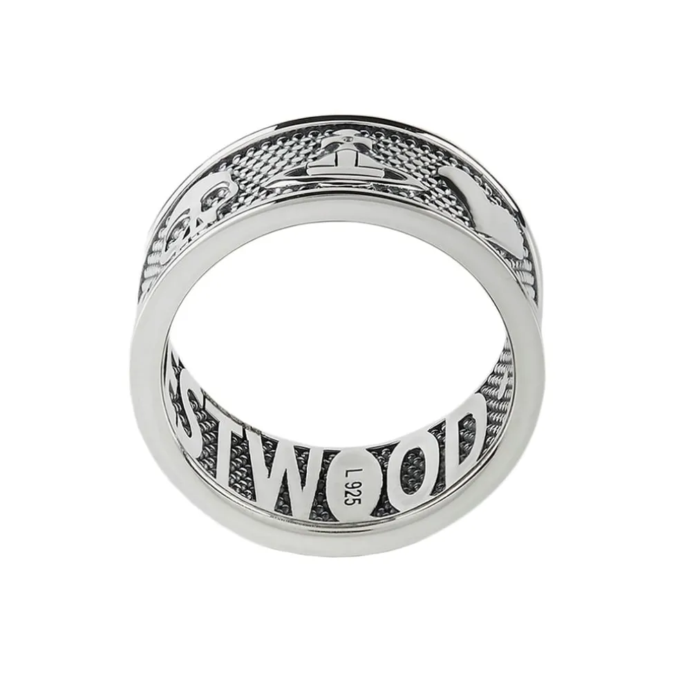 Elevate your accessory collection with the Vivienne Westwood Kingston Ring. Cut from sterling silver, this ring is designed with a thick brand engraved the brand’s signature symbols and motifs. Adorned with oxidised beads throughout, this statement ring is finished with the Vivienne Westwood branding etched onto the inside of the piece for a luxury touch. Accompanied by branded packaging.