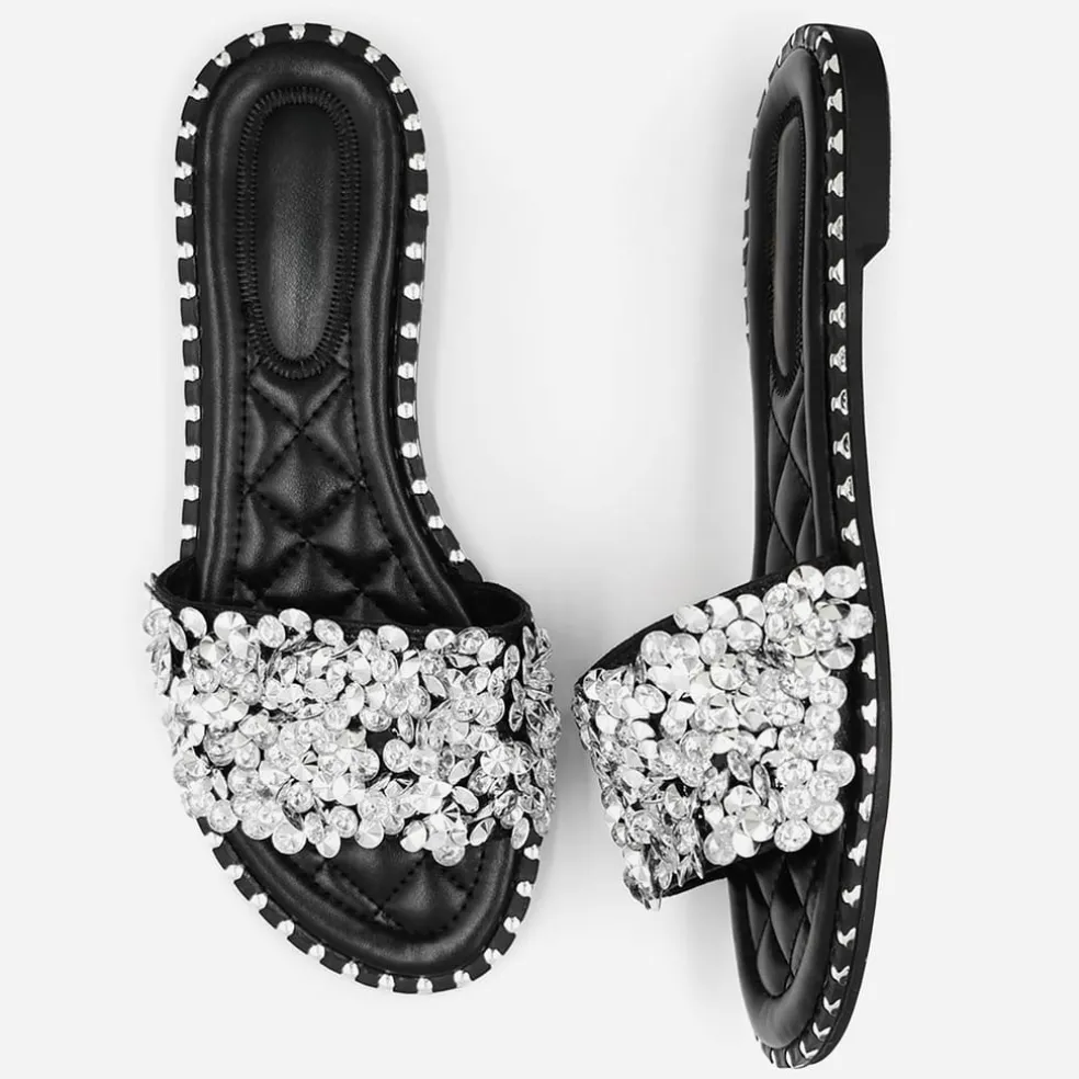 – Invest in our Diamante Sparkly Flat Sliders and experience the perfect blend of style, comfort, and durability. Step out with confidence and make a fashion statement with every stride.